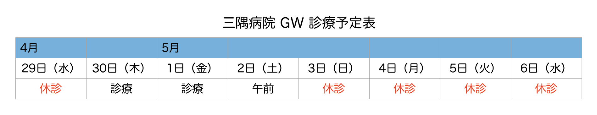 ゴールデンウィーク期間中は上記日程にて診療いたします。